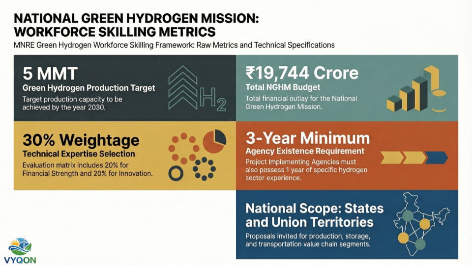 Eligible Project Implementing Agencies (PIAs) include government bodies, NGOs, and private firms with at least three years of existence and one year of specific experience in the hydrogen sector. The selection will be based on a scoring matrix: Technical Expertise (30%), Financial Strength (20%), and Innovation (20%). This program is a core part of the ₹19,744 crore NGHM budget to ensure the industry meets the 5 MMT production target by 2030.