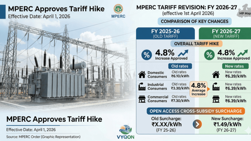 The Madhya Pradesh Electricity Regulatory Commission (MPERC) has issued its final Retail Supply Tariff Order for the Financial Year 2026-27. Following a joint petition by the state DISCOMs and M.P. Power Management Company Limited (MPPMCL), the Commission has approved an average tariff increase of 4.8% across various consumer categories, a significant reduction from the 10.19% hike originally sought by the utilities.