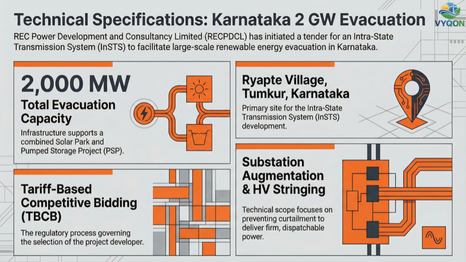 - Objective: Establishing an Intra-State Transmission System (InSTS) for a 2,000 MW Solar Park and PSP at Ryapte Village, Tumkur.