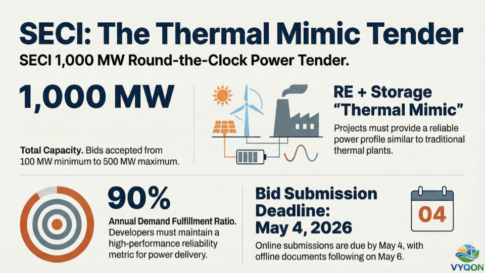 The Solar Energy Corporation of India (SECI) has issued a Request for Selection (RfS) for the supply of 1,000 MW of power from ISTS-connected renewable energy projects under a “Thermal Mimic” (RTC-TM) structure. The tender requires developers to set up RE projects integrated with Energy Storage Systems (ESS) to provide a firm and reliable power profile similar to traditional thermal plants.